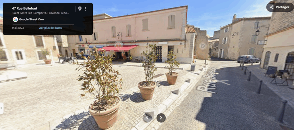 Hypercentre de St-Mitre-les-Remparts : zone de rencontre et début de végétalisation (photo Google Street View)